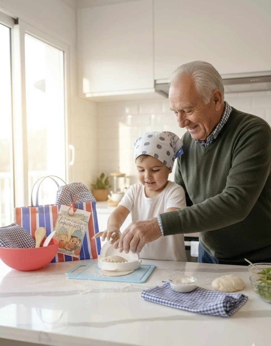 Bolsita de compras, receta de empanaditas de carne y veganas, bandana de tela, agarradera de tela, bowl, cuchara de madera artesanal, molde empanada, cuchillito de plástico, tablita de picar de plástico.