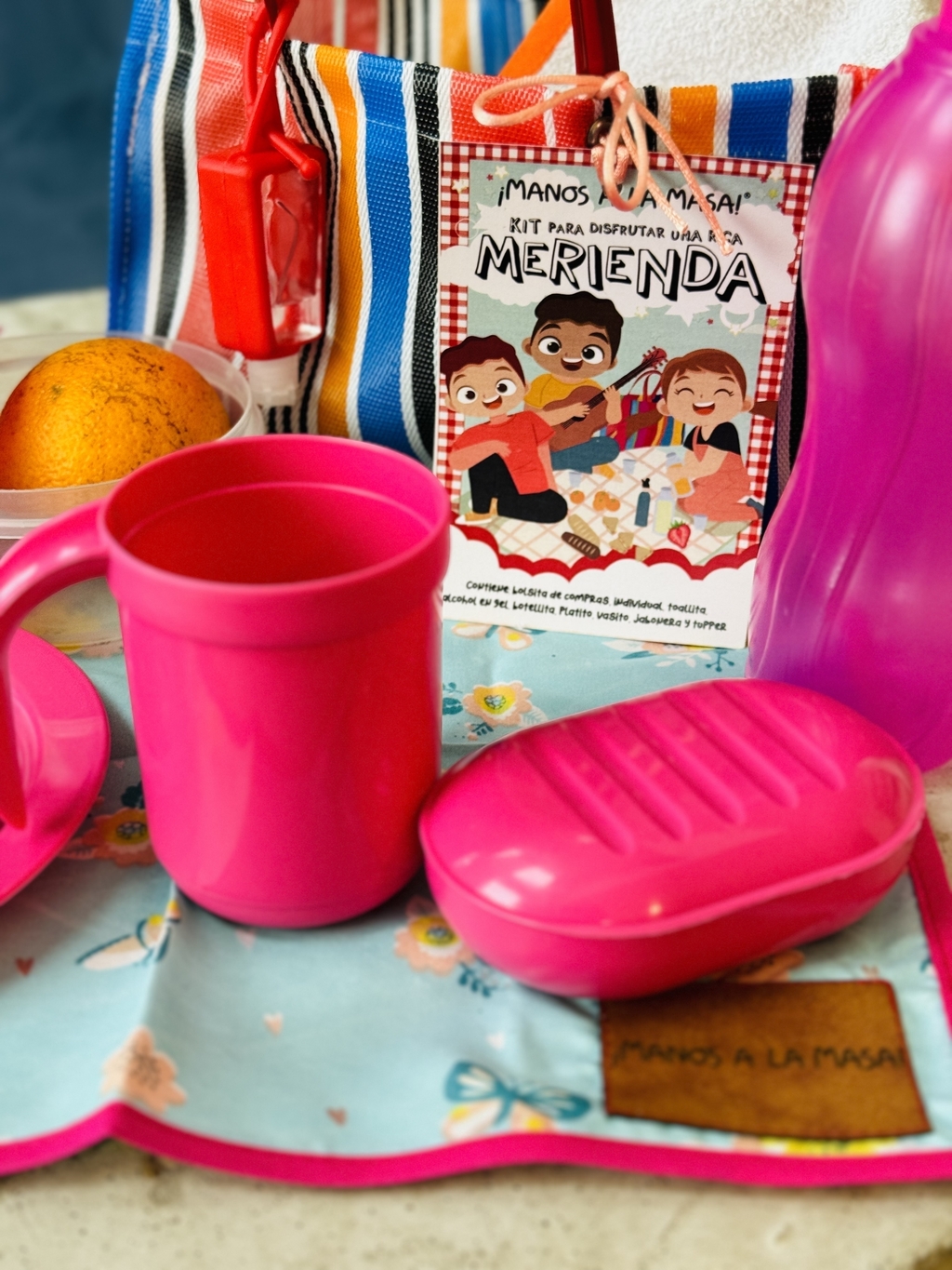 Bolsita de compras, alcohol en gel, mantel individual, toallita, tupper para galletas, botellita, jarrito, plato y jabonera.